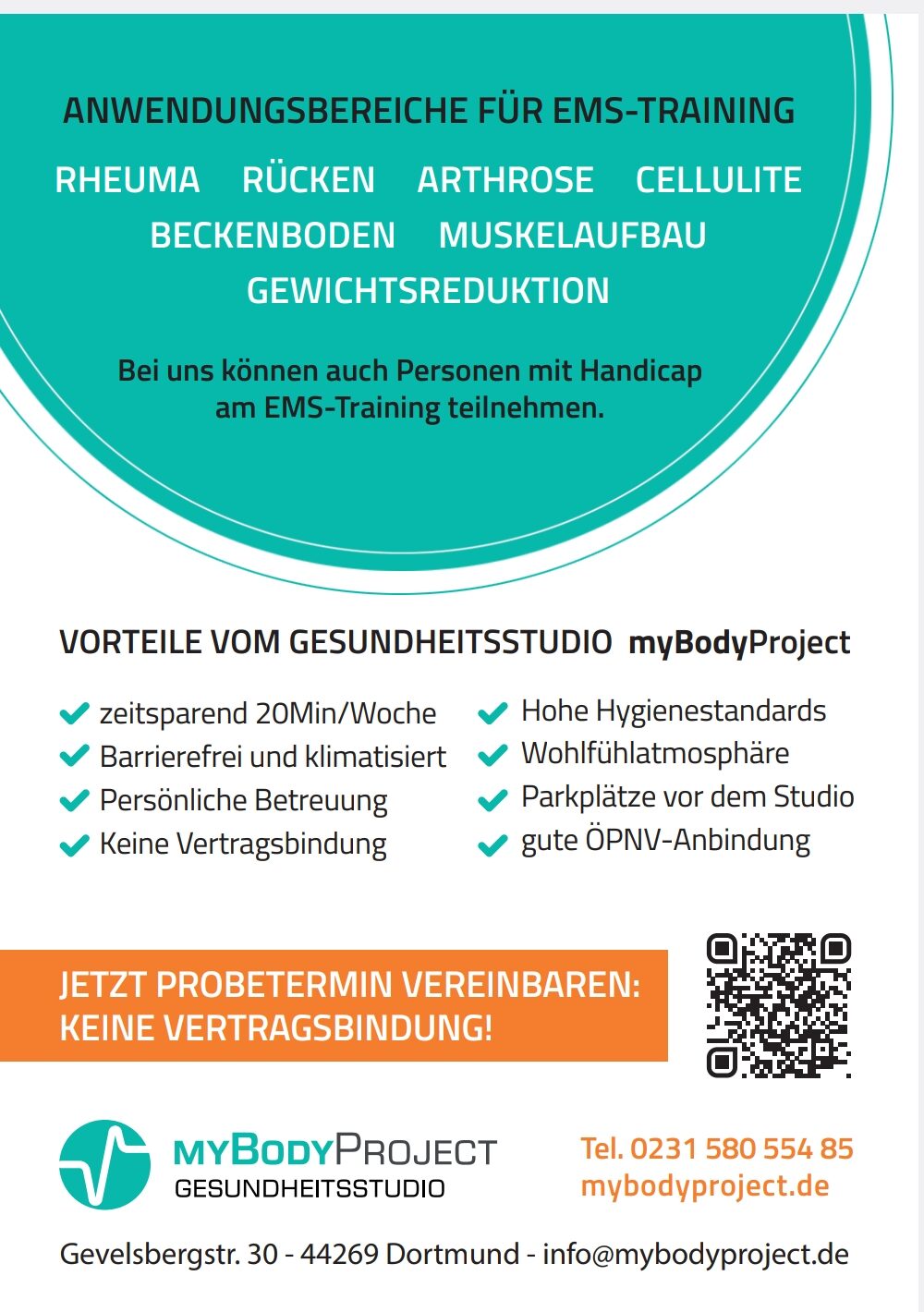 Unser Studio myBodyProject Dortmund für EMS-Training hat im letzten Quartal 2023 geöffnet. Die Werbe-Flyer für unser Angebot zum effektiven EMS-Training haben wir hier ergänzt.